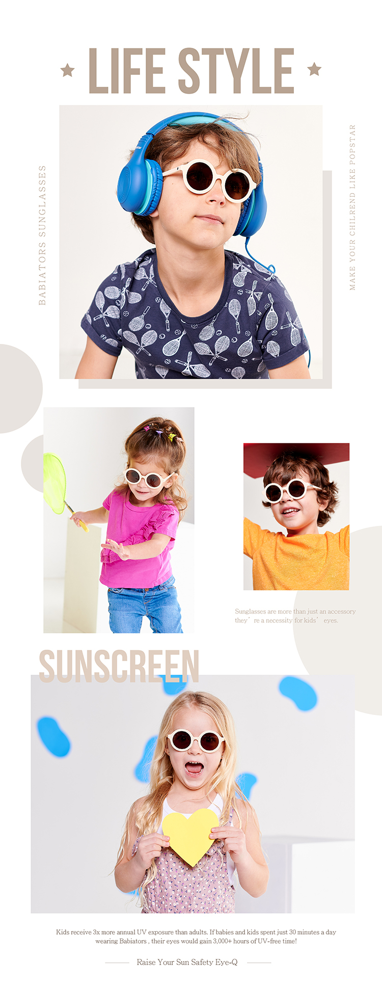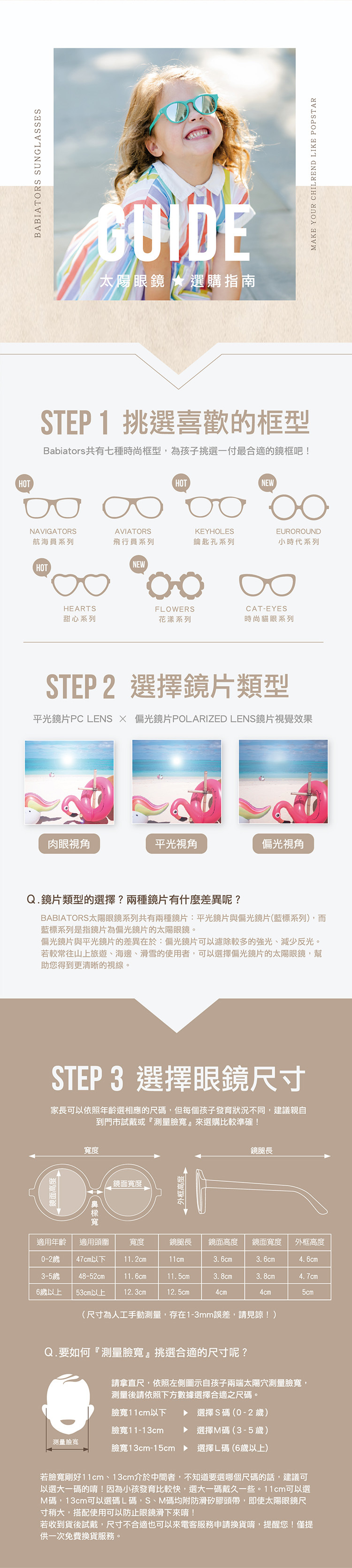⭐此款眼鏡0-2/3-5歲尺碼的邊框印刷為BABIATORS LOGO,6歲尺碼的太陽眼鏡兩側邊框印刷為BABIATORS寶寶頭像。
